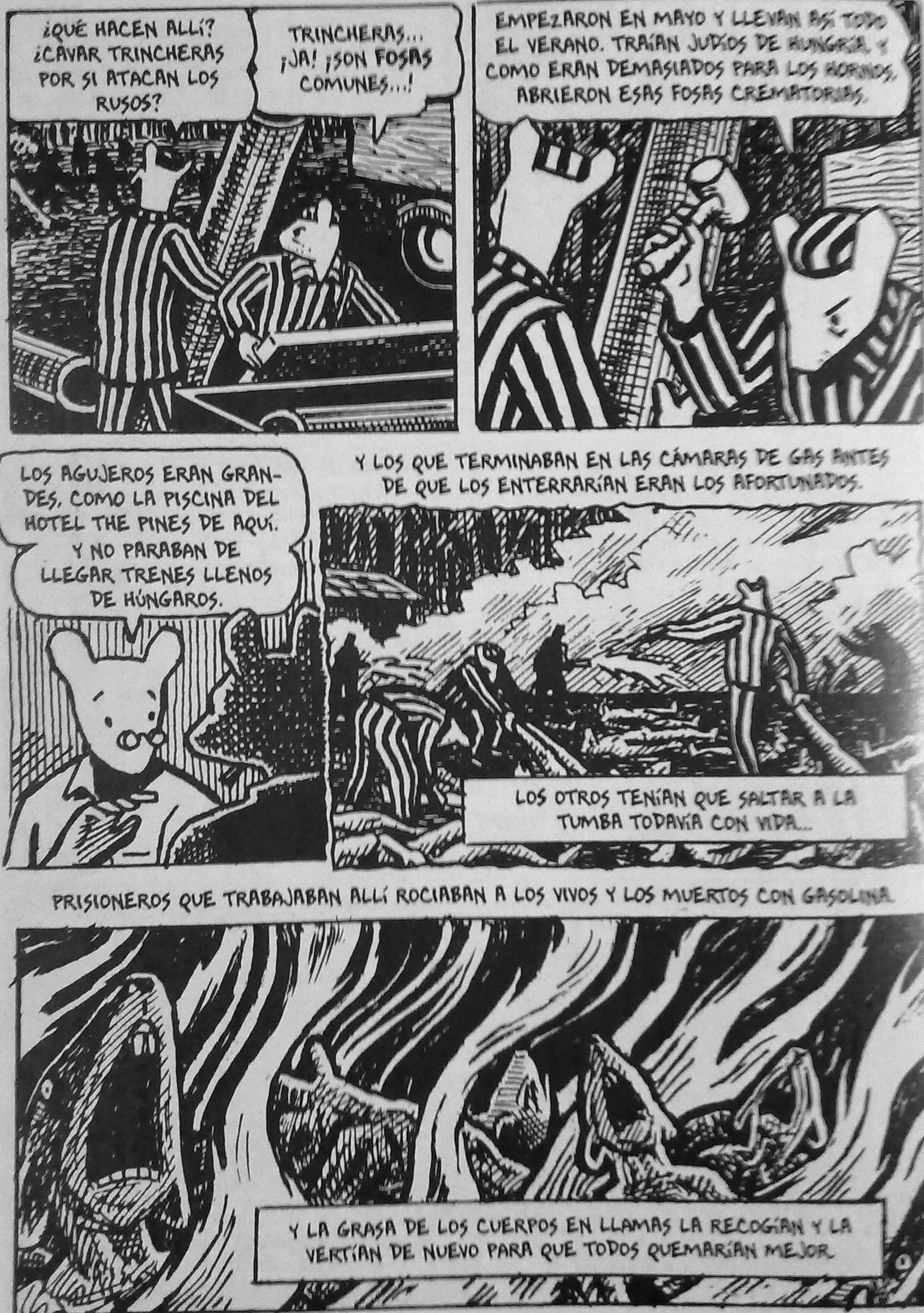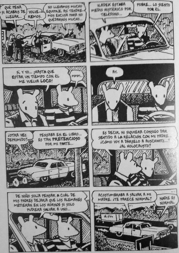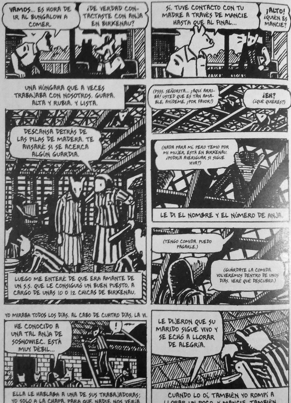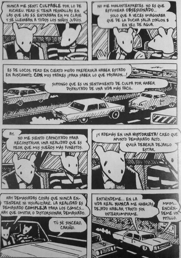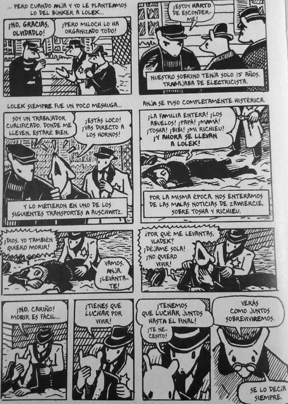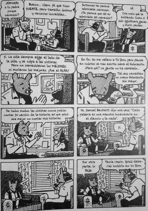 La mayoría de los que vieron el rostro de la esfinge murieron. Muchos supervivientes se suicidaron años más tarde, como Primo Levi, como Anja -la madre de Spiegelman-, porque en el fondo no era posible sobrevivir al Holocausto. Los que sobrevivieron no eran más dignos de admiración que los asesinados, no eran ni mejores ni peores que ellos. Como dice uno de los personajes de Maus: La vida siempre elige el lado de la vida y se culpa a las víctimas. Pero no sobrevivieron los mejores ni murieron los mejores. ¡Fue el azar!