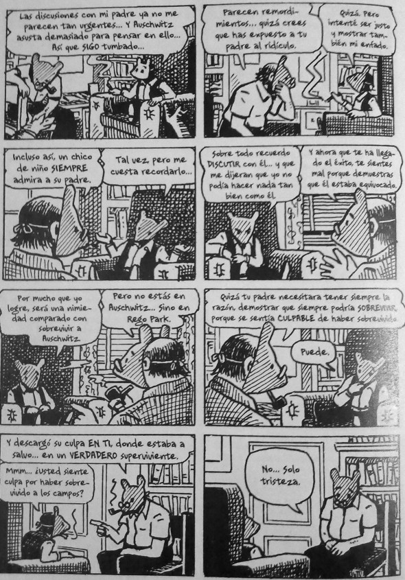 Maus es una novela gráfica que habla de las miserias de la naturaleza humana, con honestidad y valentía. Art Spiegelman describe el Holocausto, el manto de podredumbre moral que cubrió el comportamiento de todos los que se vieron afectados por él y las secuelas indelebles que el rostro del mal dejó en sus víctimas. Y lo hace de la única manera que le era posible: renovando el lenguaje para hablar de una realidad tan absoluta que amenaza con ahogar las palabras e imágenes que intenten reflejarla.
