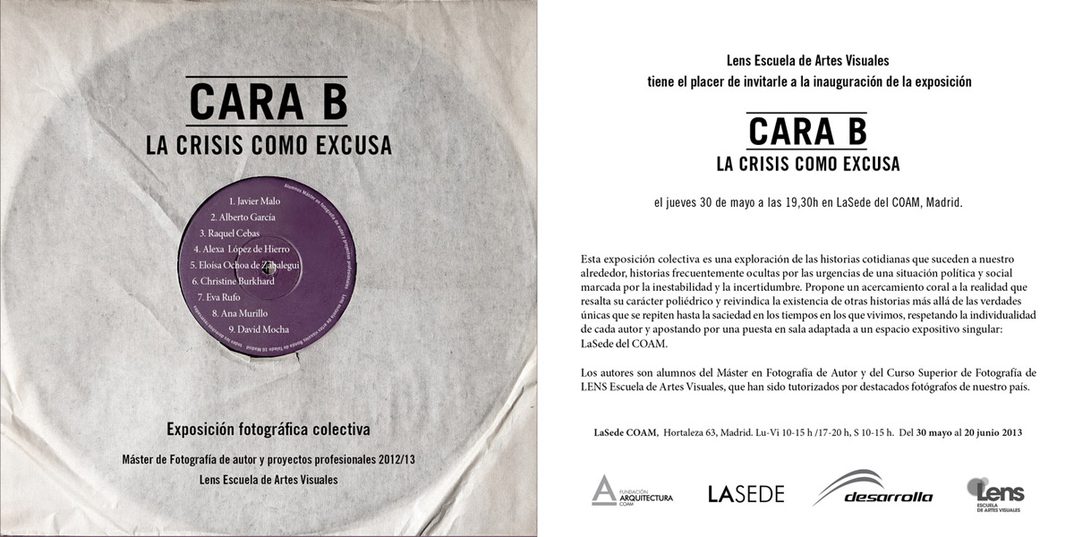 Hoy inauguramos la exposición colectiva Cara B: La Crisis como Excusa. Una exposición que he tenido la suerte de comisariar junto a Gerardo Custance y Ana Amado. Trabajar con ellos ha sido todo un lujo, como lo ha sido tener la oportunidad de apoyar el desarrollo de los proyectos de los fotógrafos que forman parte de la expo: Alberto García Herranz, Javier Malo, Raquel Cebas, Eva Rufo, Ana Murillo, David Mocha, Christine Burkhard, Alexa López de Hierro y Eloísa Ochoa de Zabalegui.
